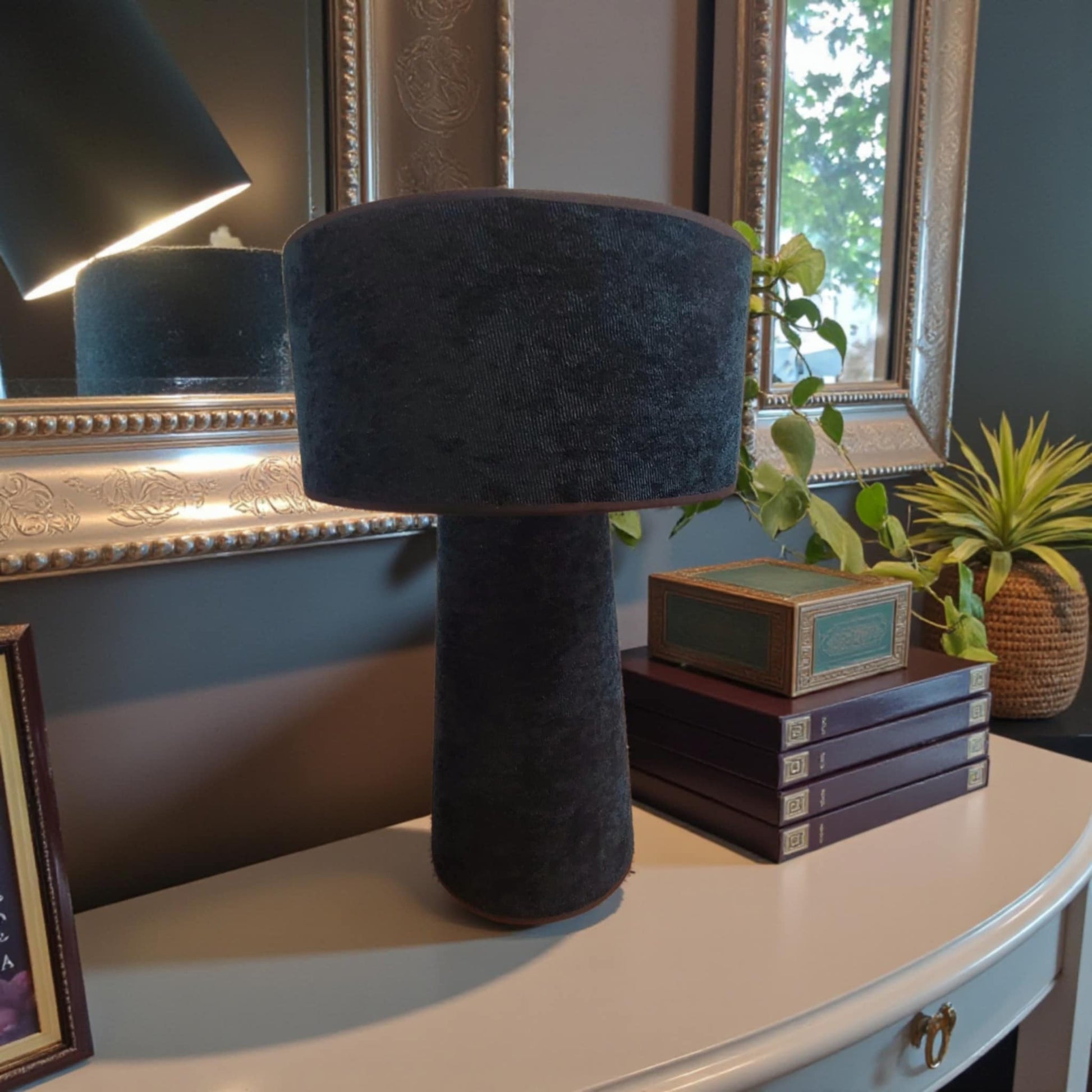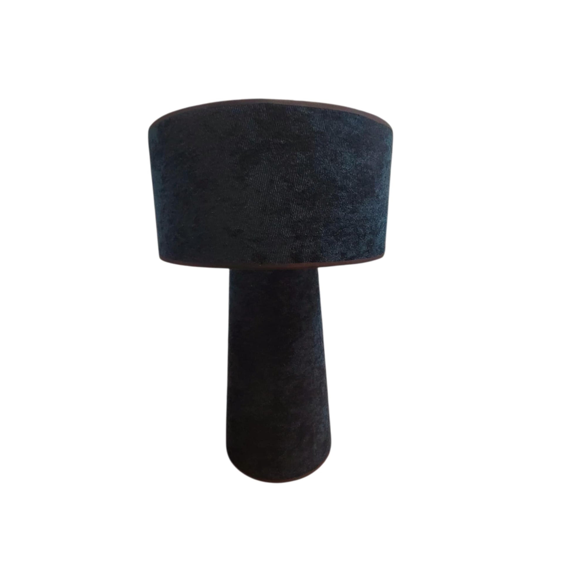 Crafted from green velvet fabric, this minimalist lamp ist very Art Deco.
